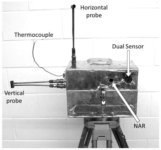 Estimating sensible heat fluxes and energy requires gas velocities and temperatures (Equations (2)–(4)). The core instruments are deployed in a Fire Behavior Package (FBPs) described in Butler et al. [38] and shown in Figure 1. The FBP includes one vertically- and one horizontally-oriented bi-directional pressure probe with +/−60 degree directional sensitivity [20] and a fine bare Type-K thermocouple (nominally 0.025 mm bead diameter) for temperature measurement. The probe characteristic dimension [20] is 12.7 mm. The ends of the fine thermocouple are welded to their corresponding leads and are not visible in Figure 1. The bi-directional probes are separated in space by approximately 36 cm while the thermocouple is positioned between the probes. The vertical probe connects to the FBP container on the left side (when the viewer faces the front of the FBP) and the horizontal probe joins the container on the top (Figure 1). Tubing transmits pressure signals from the dynamic and static sides of each probe separately to differential pressure sensors (Omega Engineering model PX137-0.3DV) which are temperature compensated with a pressure range of approximately ± 2000 Pa. Apart from instruments used to measure gas velocity and temperature, the FBP includes a Medtherm® Dual Sensor Heat Flux sensor (Model 64-20T) that measures incident radiant and total (convective plus radiant) heat deposition onto the face of the sensor and a custom narrow angle radiometer (NAR, [39]) to characterize flame emissive power. The Dual Sensor and NAR are mounted flush with the FBP’s container and are oriented towards oncoming fires as best as can be predicted prior to ignition. Data from Dual Sensor and NAR are reported elsewhere [19]. Each FBP additionally contains a Campbell Scientific® model CR1000 datalogger, two battery packs, and electronics required for each instrument. The sampling interval for all measurements is 10 Hz. The container is covered with two outer layers of fire-shelter material with an inner core of ceramic fiber insulation to prevent excessive heating. The FBP is elevated on a fire-hardened tripod to, nominally, 50 cm aboveground [19]. As such, approximately, the vertical probe is at 50 cm, the horizontal probe is at 81 cm, and the thermocouple is at 66 cm height aboveground.