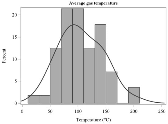 Frequency distribution of average gas temperatures over residence times measured with fine thermocouples.