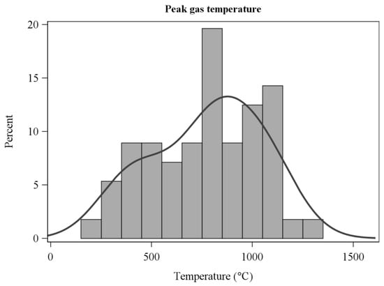 Frequency distribution of peak gas temperatures within residence times measured with fine thermocouples.