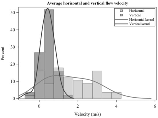 The frequency distribution of average horizontal and vertical flow velocities showed a wide range across collections (Figure 5) and were not correlated which each other (R = −0.1, p = 0.6). Average horizontal velocities were larger than vertical velocities (Figure 5, Table 2). Peak flow velocities (Figure 6) show high instantaneous values, particularly for horizontal flow. Average sensible heat fluxes were greater in the horizontal than vertical directions (Table 2, Figure 7). As for flow velocities, horizontal and vertical sensible heat fluxes were not correlated (R = 0.24, p = 0.07). Peak horizontal and vertical sensible heat fluxes were often large (Figure 8) but fluctuated dramatically in our 10 Hz data (Figure 9). Residence times were strongly correlated with vertical sensible energy (R = 0.6, p > 0.0001) but were weakly correlated to horizontal sensible energy (R = 0.26, p = 0.06). The increase in residence time with sensible energy can be seen in Figure 9 in a comparison between timeseries with the lowest and median resultant sensible energies and that from the greatest resultant sensible energy.