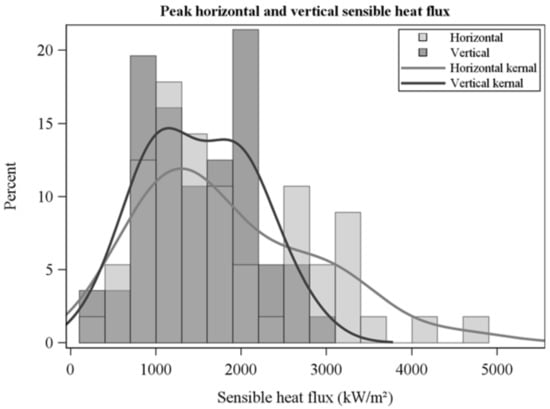 Bi-directional probes oriented vertically and horizontally clearly miss flow in the third, that is, crossways direction. As such, even though the probes have a wide acceptance angle [20], flux and energy are underestimated. We attempted to minimize this problem by only accepting fires for which we had evidence that average flows were upwards and towards the front of the FBP (Figure 1). We do not pretend that we eliminated the problem, however, given that we had no information on crosswise flow and recognize that the turbulent flow that characterizes flames and plumes is three dimensional [37]. The high variability in sensible heat fluxes shown in Figure 9 reflect this turbulence and the intricate structure of turbulent diffusion flames [55]. Three-dimensional measurement would clearly be beneficial. We point the reader to a probe assembly involving two precisely oriented bi-directional probes that provides three-dimensional flow except under specific conditions [56]. Adding a third (crossways) bi-directional probe may be preferable to avoid limiting conditions [54]. Clearly, a worthy challenge for fire science is to develop accurate methods for measuring three-dimensional flow in situ.
