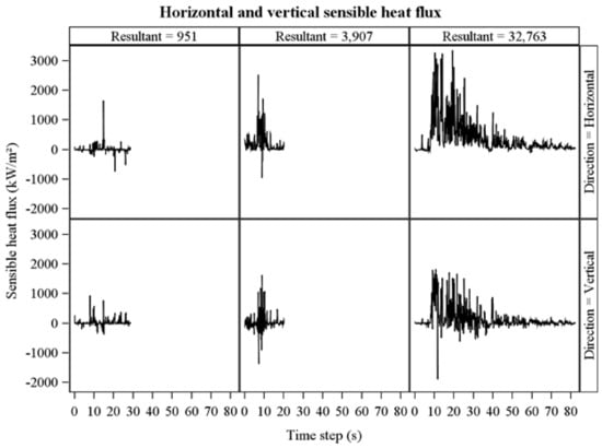 Due to the separation between horizontally- and vertically oriented bi-directional probes (Figure 1), more appropriate for large flames, we are unsure of the error in flow direction based on a resultant of the two instantaneous measurements and we have not reported them here. Proximity of multi-dimensional flow measurements will deliver data that will provide more accurate estimates of flow direction [54]. Currently, the thermocouple used in the FBP (Figure 1) is located between the two probes, a design that is not ideal, but, we assume, supports estimates of sensible energy that are approximately correct after horizontal and vertical sensible heat fluxes are integrated over residence times.