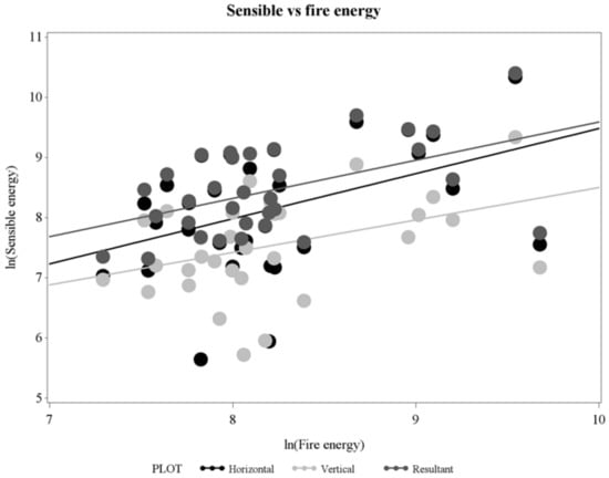 Horizontal, vertical, and resultant sensible energies (kJ/m2) as a function of fire energy (kJ/m2) estimated from overhead radiometers on natural log-transformed axes.