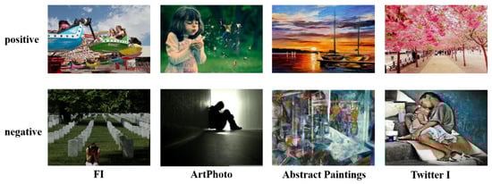 - Small-scale dataset: IAPSsubset comes from International Affective Picture System [33] and has 395 images in eight emotional categories. Different from other datasets, ArtPhoto is a dataset composed of 806 art photos, and Abstract Paintings consists of 228 abstract pictures of colors and textures. Twitter I and Twitter II were collected from social network Twitter and labeled by AMT workers with 1,269 and 603 images. We set up experiments similar to [28,32] on all three subsets of Twitter I. EmotionROI is developed from Emotion6 [34], and the image comes from the Flickr website. Compared to Emotion6, EmotionROI adds 15 emotion-related annotation boxes to each image marked by participants and believes that the more repeated annotation boxes on a pixel point, the greater the contribution of the point to emotional expression.