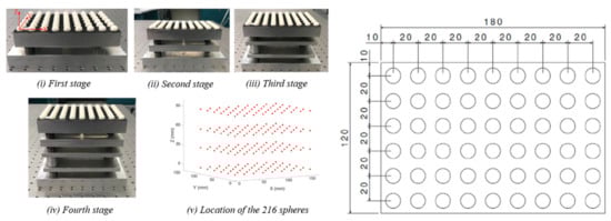 As shown in Figure 3, at the first stage, the artifact sits directly on the baseplate via kinematic couplings without the use of any spacer. The other three stages from the second to the fourth stage are obtained by mounting the same ball-plate on top of spacers. A spacer of 30 mm nominal height and a spacer of 60 mm nominal height create the second and the third stage, respectively, and stacked together they generate the fourth stage. The use of kinematic couplings ensures the repeatability of the assembly. As an improvement over the original design, magnets were added inside the kinematic couplings linking the baseplate, the ball-plate, and the different spacers in order to avoid any loss of the kinematic contacts during the CMM calibration, as the touch-trigger probe applies a significant force along Z-axis of the probe. Other details of the artifact design can be found in [13].