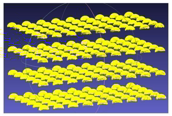 For a global performance or validation test, as well as for the impact of distance and exposure time, the complete pseudo-3D artifact, i.e., all four stages, was used. The depth of field of the HandySCAN BLACK is 250 mm. Therefore, to cover almost the entire depth of field of the scanner, we scanned the complete pseudo-3D artifact at two locations. First, the artifact was placed in a way that the first stage was 285 mm from the scanner, meaning that the fourth stage was 195 mm from the scanner. Next, the artifact was placed in a way that the first stage was 405 mm and the fourth stage was 315 mm from the scanner. Altogether, the two scans resulted in eight stages (Figure 9) that covered almost the entire depth of field of the HandySCAN BLACK.