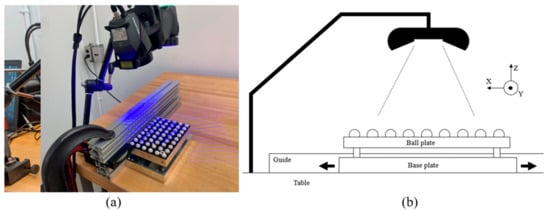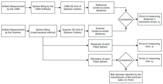 The two artifacts of the standard (i.e., ball-bar and flat plate) provide information on the abilities of the scanner in measuring form, size, and distance inside its measuring volume. As discussed by Ghandali et al. [13], the whole measuring volume cannot be comprehensively and systematically evaluated when using the standard’s recommendations, because both the ball-bar and the flat plate are scanned in a limited number of positions and orientations, while the user needs to systematically characterize the scanner’s performance in its entire measurement volume. Hence, there is a need for both adapted artifacts and new procedures to better characterize 3D scanners. Various attempts at creating custom artifacts or proposing new methods have been made [6,14,15] to provide information on specific aspects of the devices. The proposed artifacts usually consist of canonical shapes such as an arrangement of cylinders, planes, and spheres [16], or freeform shapes [17]. Some studies address the evaluation of CMM-mounted laser scanners [18,19,20,21], while others address laser scanners integrated with measuring arms [22]. Some artifacts are dependent on a reference frame being generated as the scans progress. The scan might also be required to be aligned with the reference data or CAD model [23], or aligned with other scans to compare them, which can mix the errors being evaluated with the alignment errors. Genta et al. [24] have used a 2D ball-plate as a reference artifact for calibrating a laser scanner. They measured the coordinates of the centers of precision balls of the artifact once with a contact probe on CMM and then with the scanner. Then, they assessed the performance of the scanner based on the difference between the coordinates of the ball centers obtained from the two measurement sets. The comparison of the coordinates of the ball centers requires registration to bring the two data sets in a common coordinate frame, which can increase the uncertainty of the assessment method.