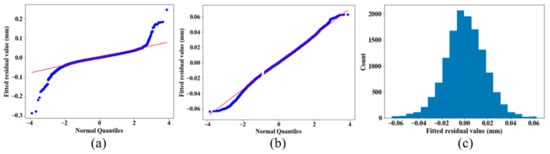 (a) Unfiltered-residuals Q–Q plot; (b) filtered-residual Q-Q plot; (c) histogram of filtered residuals. For the filter, the absolute fitted residuals more than 3 times the standard deviation of the whole population were considered outliers and removed.