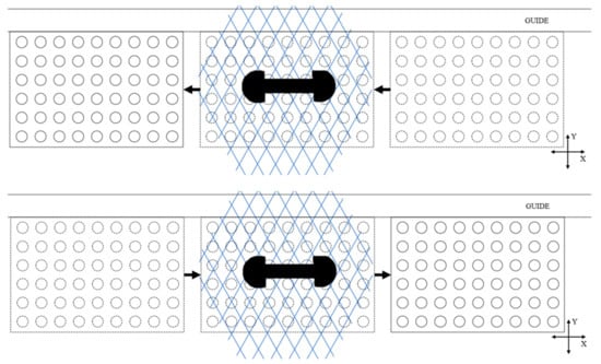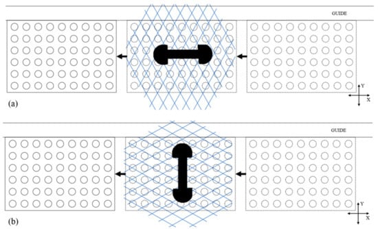 The orientation of the scanner was defined by the line joining its two cameras. To simplify the process for the movement of the scanner, two translations, corresponding to the two orientations of Figure 13, were considered as scanning patterns: the artifact will move in a straight motion relative to the scanner, and no rotation will be involved. The X-orientation was defined by the line joining the two cameras, parallel to the longest edge of the artifact, and the Y-direction was orthogonal to the X-direction.