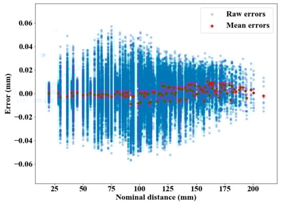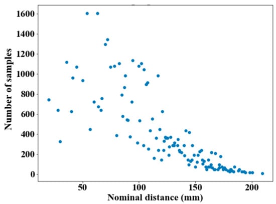 No trend seemed visible at first, and the errors fluctuated around 0, which means that the scanner almost equally overestimated and underestimated the measured distances in its measuring volume. The distances in the 50–125 mm range were subject to the largest variations for an identical nominal distance, which seemed consistent with the fact that they included a large portion of the total number of samples of distances (Figure 11), thus variations were more likely to occur.