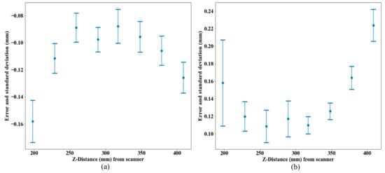 The negative error values in Figure 12a revealed that the scanner underestimated the diameter of the spheres. Figure 12 shows that both errors had smaller absolute values at the stages located near the manufacturer’s recommended stand-off distance (300 mm). The next section will present more results concerning different scanning parameters, including the Z-distance range.