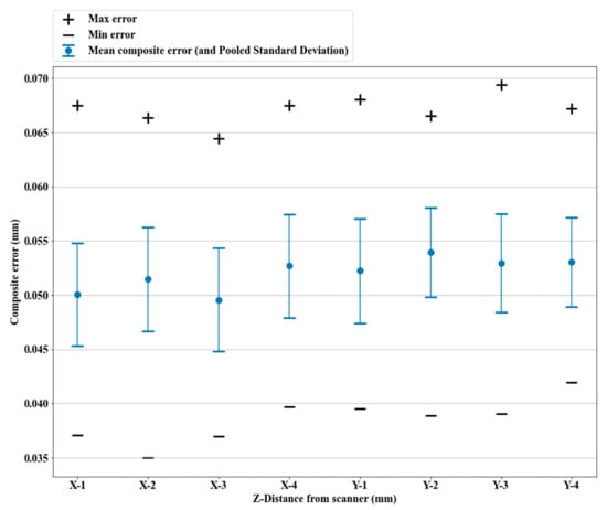 The composite error was complementary to the three individual errors, and all those metrics were studied independently to draw conclusions. Moreover, the errors used in the computation were the absolute maximum, minimum, and mean errors for each category, to show the two extremes for the composite error, and , and the mean composite error . We used the composite error to evaluate the effects of the scanning parameters on the accuracy of scan data (see Section 3.2).