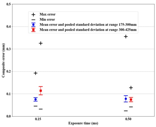 Composite error (, , , and ) vs. exposure time. The four stages of the artifact were scanned. An adequate exposure time for different ranges helped to reduce the errors. For visibility purposes, the points were slightly offset from their 0.15 and 0.5 values.