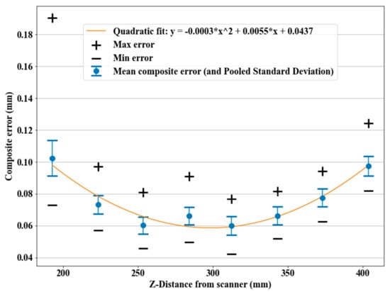 Figure 16 shows the mean, maximum, and minimum composite errors for each stage inside the measuring volume of the scanner. After a quadratic regression on the mean composite errors, the bottom of the parabola matched the stand-off distance specified by the manufacturer. This procedure, in combination with the artifact, seemed able to validate the performance of the scanner and pinpoint its limits.