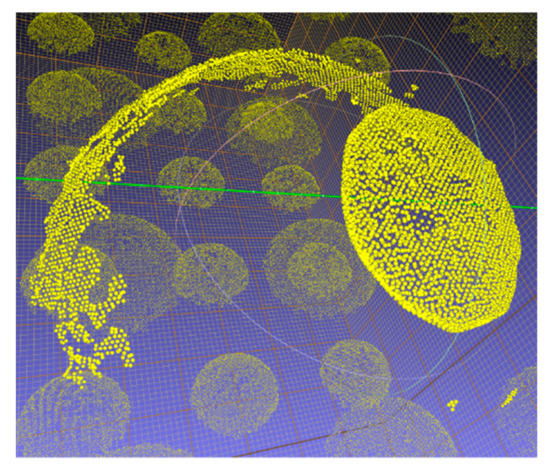 A large maximum composite error was observable on the closest stage to the scanner (195 mm Z-distance). After examining the point clouds, a poor point cloud with partial coverage of a sphere was found at that stage (Figure 17). The sphere was overexposed to the laser lines that were reflected straight toward the sensors. This resulted in the worst acquisition across the grid, which caused a poor fit and the worst result across the 3D grid.