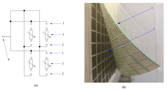 Tactile robotic skin. (a) Wiring diagram of robotic skin for proximity measurements for a 2 × 2 FSR matrix; 1—first connection of comb electrodes (electrodes connected in rows), 2—second connection of comb electrodes (electrodes connected in columns), 3—FSR sensors, 4—connection of open capacitor working plate described in Section 3.2. (b) the robotic skin; 1—a conductive layer of comb electrodes printed on plastic foil; 2—FSR sensors arranged in a rectangular pattern placed on a plastic foil.