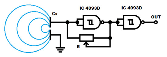 Electrical circuit of the measurement system for the change in capacitance of the open capacitor. —open capacitor, R—adjusting potentiometer, IC (Integrated Circuit)—4093 Schmitt NAND gate.
