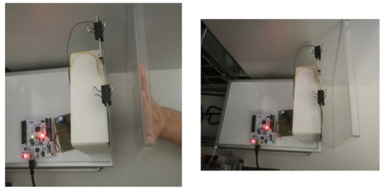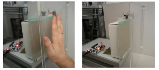 The open capacitor is made of two plates: a working plate located under the resistance touch sensors and a reference plate located next to the touch sensors (Figure 3). If the object above moves to the work plate, the capacity of this set changes. When an object with relative permittivity different from air permittivity shifts towards the working plate, the capacity increases.
