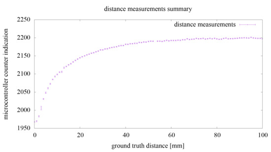 Regarding the second experiment, in the presented system, we set the measurement time from 2.82 to 728 s. However, the measurement time is important when it comes to the accuracy of the results obtained. When using longer measurement times, it is possible to more accurately determine the position of the object in relation to the sensor. The use of shorter times enables the detection of the presence of an object near the sensor but does not provide precise information regarding the distance at which the object is located. For equal to 256 and the measurement acquisition time 2.82 s, we were not even able to detect the presence of an approaching object.