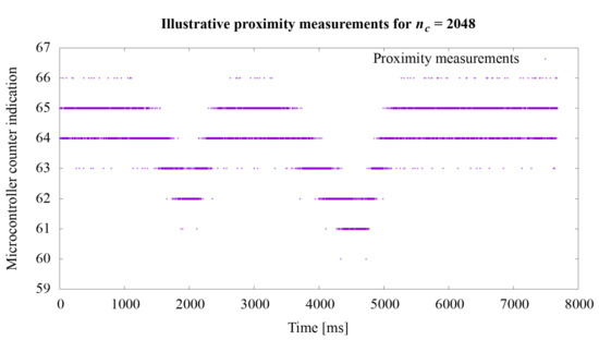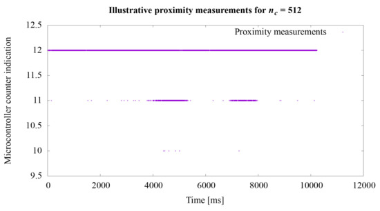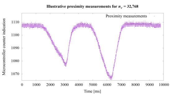Regarding the second experiment, the measurement results for the value n from the Equation (1) are shown in the graphs in Figure 8, Figure 9 and Figure 10. In the first experiment, the value of directly influencing the measurement time was set at 65,536, which gave the acquisition time approximately 728 s. The graphs show how the sensitivity of the system to object proximity changes due to the reduction of this time. For the value equal to: 32,768, 16,384, 8192, 4096, 2048, 1024, 512, 256, the measurement acquisition time is, respectively: 361, 180, 90, 45, 22.5, 11.26, 5.63, and 2.82 s. On the basis of the selected graphs, it can be seen how the reduction of the measurement acquisition time has a negative effect on the proximity detection. A more extensive discussion of these results is provided in the next section of the manuscript.