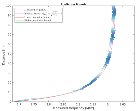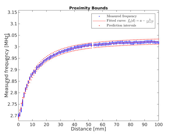 The developed sensor is to be used to determine human proximity. For this purpose, in further works, the inverse characteristic to that presented in Equation (2) was transformed. The inverse characteristic is represented by Equation (3). Using the transformed equation, it is possible to calculate the distance from the sensor by measuring the frequency of the signal.