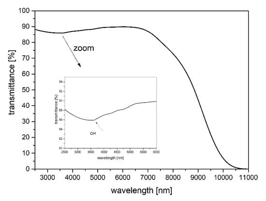 However, regarding low-phonon glasses, only ZBLAN and fluoroindate can be drawn into high-quality optical fibers. Fluoroindate glass is one of the infrared materials that offers continuous optical transmission from the ultraviolet to midinfrared without any absorption peaks and can be drawn into good quality fibers, while their transmission window is much wider than standard zirconium fluoride based glass []. The absorption band at 3.3 μm shown in the inset of Figure 1 provides information about the hydroxide group content within the structure of each of the produced forms of glass. It is known that OH− groups have a strong negative impact on MID-IR luminescence. The hydroxide concentration and the absorption coefficient at the wavelength of 3.1 µm and can be estimated according to the following equations [,]:
