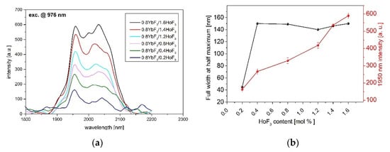 (a) Near- infrared (IR) luminescence spectra and (b) FWHM (Full With at Half Maximum), 1950 nm intensity of 0.8YbF3/(0.2–1.6)HoF3 co-doped fluoroindate glasses, λexc = 976 nm.