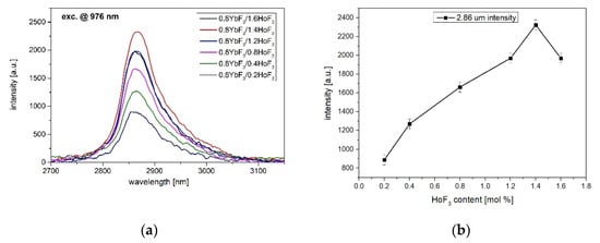 Figure 3a shows the MID-IR emission spectra of 0.8YbF3/(0.2–1.6 mol%)HoF3 co-doped fluoroindate glasses excited at 976 nm. Due to the Ho3+: 5I6 → 5I7 transition, the broad and intense luminescence band at 2.85 μm was measured. It was also found that 2.85 μm luminescence intensity increases upon increasing Ho3+ ions up to 1.4HoF3 (0.8Yb-1.4Ho glass) and then reduces with further increasing of HoF3 (Figure 3b).