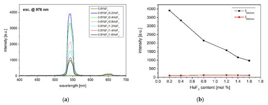 The calculated absorption coefficient and hydroxide groups content was found to be 0.088 cm−1 and 3.82 ppm, respectively. Since composition of the glasses host is very similar and they were prepared and melted in glove boxes, all glasses were found to have a similar amount of water. The obtained result is better than in fluorophosphate glass (35.5 ppm) [] as well as fluoroaluminate glass (22.2 ppm) []. The reduced OH− content results in an increase in quantum efficiency under the excitation of a 976 nm laser [].