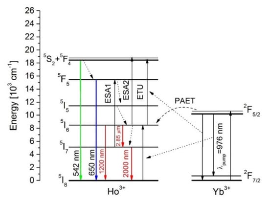 To explain the 2.85 μm, 2 μm, and upconversion emissions as well as the energy transfer mechanism in Yb3+/Ho3+ under 976 nm laser excitation, the energy level diagram was proposed based on the previous investigations and presented in Figure 5 [,].
