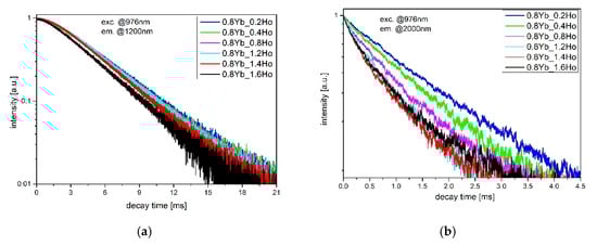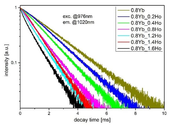 The decrease in decay time with increasing Ho3+ concentration can be explained as the increased probability of the energy migration process between Ho-Ho pairs. A similar effect has been observed in barium gallo-germanate glasses [].