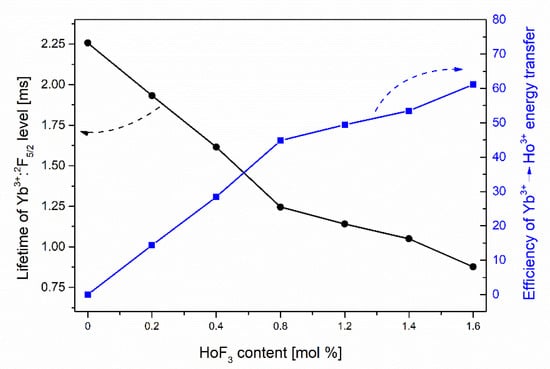 The Yb3+: 2F5/2 luminescence lifetime and the efficiency of the Yb3+ → Ho3+ energy transfer as a function of HoF3 content.