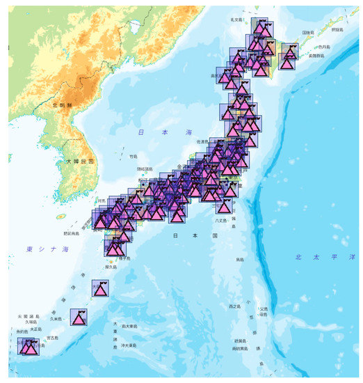 GNSS Earth Observation Network (GEONET), the Japanese nationwide GNSS receiver network, has been operated by the Geographical Survey Institute of Japan since 1994 [21]. It has expanded into a dense network of more than 1300 permanent receivers by November 2020, one of the densest GNSS receiver networks on earth. Its distribution is shown in the Figure 1. The two-dimensional ionospheric disturbances over Japan can be mapped with GEONET high-resolution observation data [22]. These receivers are located at an average interval of about 25 km and continuously provide GNSS data at a sampling rate of 30 s [23]. GEONET has been used for long-term observation and monitoring of crustal deformation [10,24], and has been used to solve global and regional issues such as earthquake forecasting, disaster management, high-precision crustal deformation, and strain analysis. It can also be used to evaluate performance and suitability of a regional ionospheric model. The 30 s sampling rate data are available via ftp://terras.gsi.go.jp (accessed on 15 March 2021).