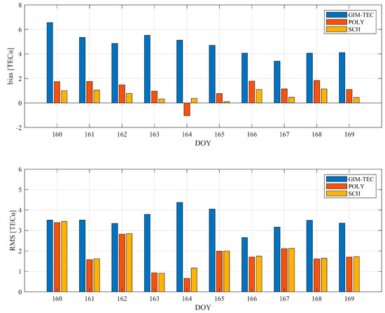 Ionospheric TEC average bias and RMS of the POLY model and the SCH model in Japan from DOY 160 to DOY 169 in 2019.