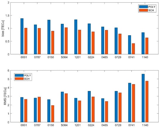 The average bias and RMS errors of 10 stations evenly distributed in Japan according to latitude were calculated in order to investigate the variation of the accuracy of the model with latitude. The results are shown in Figure 4. The stations are arranged from high latitude to low latitude. The average bias of the polynomial model and the spherical cap harmonic function model are in the range of 0.5–1 TECu. The RMS errors of the mid-latitude stations are lower than the RMS errors of the low-latitude stations, while it tends to increase as the latitude decreases.