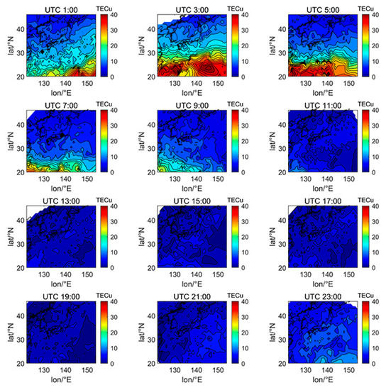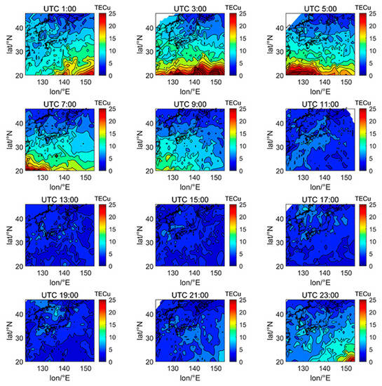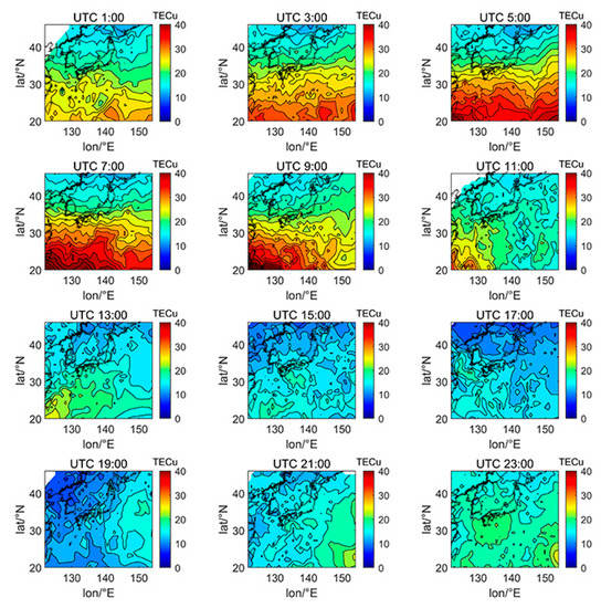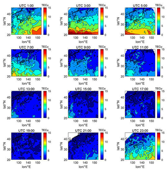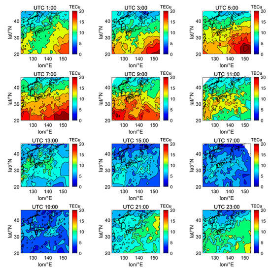Figure 5, Figure 6, Figure 7, Figure 8, Figure 9, Figure 10 and Figure 11 show the spatial distribution of ionospheric TEC on DOY080, DOY172, DOY266, and DOY356 in 2014 and 2019. As the earth rotates and revolves in an elliptical orbit around the sun, the ionospheric TEC at mid latitude and low-latitude has obvious diurnal and seasonal variations. Within one day, the ionospheric TEC generally peaks at noon (12:00–14:00 local time) and reaches its trough at night or morning. It can be clearly seen that the TEC peak area continues to move westwards. The diurnal variation of TEC in Japan is greatly affected by solar activities. The TEC peak (3:00–5:00 UTC) in the high solar activity year can reach 2–3 times that of the low solar activity year, while the TEC in most areas at night drops below 5 TECu.