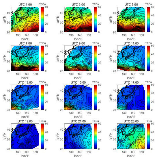 Spatial distribution of TEC in Japan at 2-h intervals in DOY172 in 2019.