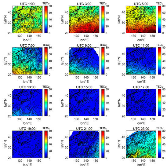 Spatial distribution of TEC in Japan at 2-h intervals in DOY080 in 2019.