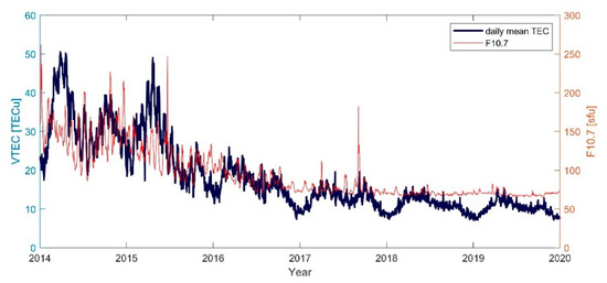 Time series of daily mean TEC and solar activity index.
