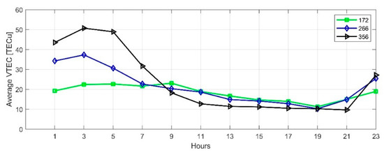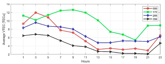 We used the SCH model to calculate TEC of the selected date in Section 4.1. Figure 13 and Figure 14 show the diurnal variations in equinoxes and solstices of the high solar activity year (2014) and low solar activity year (2019), respectively. Affected by solar activities, the ionospheric TEC in 2014 was significantly higher than in 2019. When the ionospheric TEC is in a calm state, it is the smallest in winter and the largest in summer, when the sun has the highest angle over horizon in Japan. On DOY356 in 2014, the disturbance storm time (Dst) index decreased to −51nT, and an ionospheric storm occurred, which increased the diurnal variation of TEC on that day.
