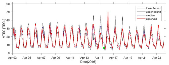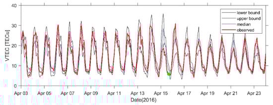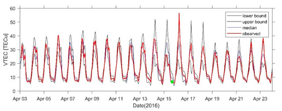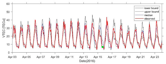 VTEC time series from 3 to 23 April at SHAO Station. The green dots indicate the time of the earthquake.
