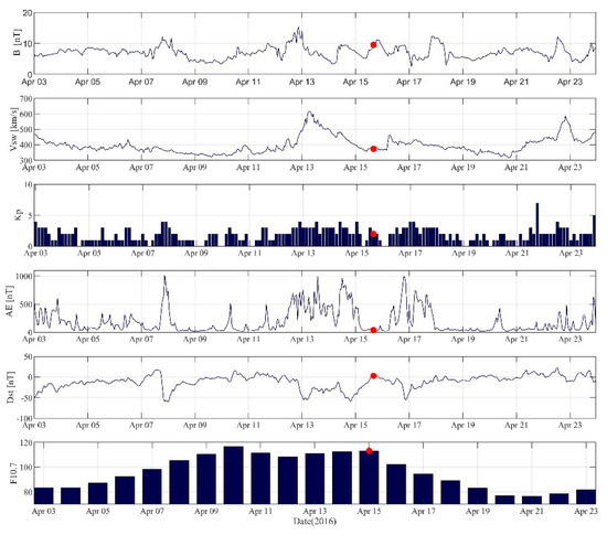 Solar and geomagnetic indices from 3 to 23 April 2016. The red dots indicate the time of the earthquake.