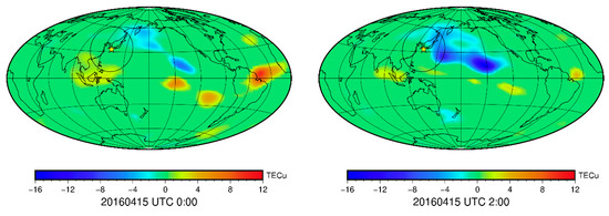 In order to further analyze whether the TEC disturbance on 15 April is related to the earthquake, we used the VTEC within 10 days before the earthquake as the background, and calculated the median m and standard deviation σ. If the VTEC on 15 April is higher or lower than m ± 2σ at the corresponding time, there may be the TEC disturbance. The global TEC disturbances at the 2-h interval between 0:00 UTC and 18:00 UTC on April 15 are shown in Figure 20. The yellow ★ is the location of the epicenter, and the black ellipse is the influence range of the Kumamoto earthquake calculated according to the Dobrovolsky formula [33]. At 0:00 UTC, there is no obvious TEC disturbance in Japan. At 2:00 UTC, a negative TEC disturbance of −3–−4 TECu appeared in northeast Japan, and another negative disturbance of −4–−8 TECu appeared in southeast Japan. The disturbance reached its maximum at 25 °N and 155 °E, then moved westwards slowly in the influence range of the earthquake. At 4:00 UTC, the negative TEC disturbance covered northern and southeastern Japan. At 6:00 UTC, the negative TEC disturbance area in northern and southern Japan expanded significantly, gradually covering most of Japan and approaching the epicenter. After that, the TEC disturbance remained at −2–−4 TECu and gradually weakened from 14:00 UTC to 18:00 UTC when the TEC disturbance in the area affected by the Kumamoto earthquake completely disappeared.
