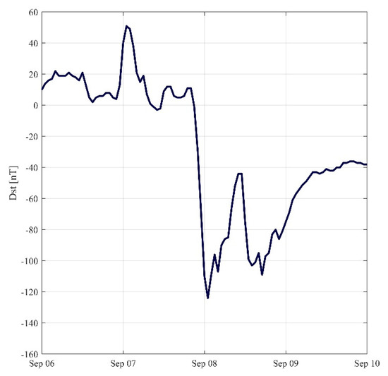 In this section, we extracted the Dst index time series from 6 to 9 September 2017. As shown in Figure 21, Dst dropped sharply to −124 nT at 2:00 UTC on 8 September, and dropped to −109 nT again at 18:00 UTC, indicating that violent geomagnetic activity occurred from 7 to 8 September, possibly accompanied by a geomagnetic storm. In order to detect the possible ionized blobs, bubbles and small-scale scintillation during geomagnetic storms in Japan, the TEC variations on 8 September were inverted to observe this type of phenomenon.