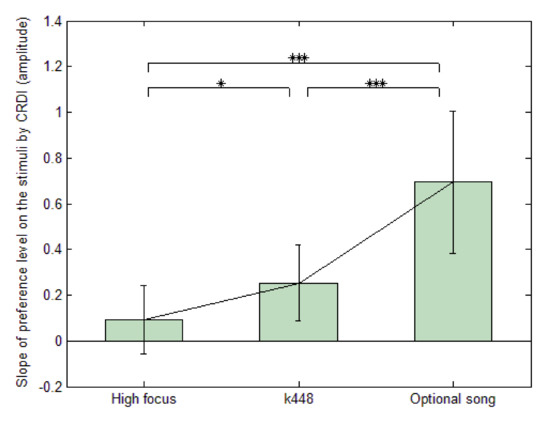 To research the cognitive states involved in brain activities, Figure 4 shows the results of self-rating on cognitive state stimulated by HF, K448, and FS, respectively, analysed by ANOVA (denoting M = 3.36, 4.25, and 6.61; SD = 1.28, 1.96, and 1.73). The results show that the subjects agreed that FS aroused significantly higher state levels than HF and K448. In contrast, HF and K448 evoked no comparably different states for the subjects. Furthermore, by applying Pearson’s product-moment correlation to calculate the correlation between cognitive state and CRDI response, the results revealed a significantly moderate correlation, as shown in Figure 5. This result suggests that the intensity and amplitude of the preference level were linear with the subjects’ subjective ratings of cognitive state, indicating that greater preference and intensity would positively affect the listeners’ cognitive states.