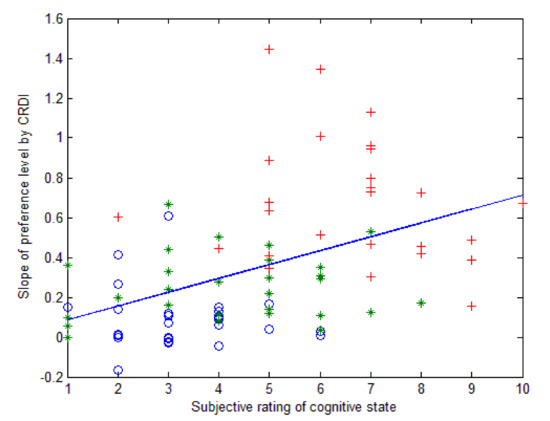 However, averaging the preferred response during the overall period to a musical excerpt easily influences the correction by evening out the preferred result of the excerpt. In the experiment, many subjects’ preference curves sketched upward quickly at the beginning of a musical piece and then continued steadily upward until the end of the piece, according to the raw CRDI data, revealing the subjects’ feelings about the stimuli in real-time. Therefore, to eliminate and avoid deviation at the beginning of the measurement, we proposed a slope, rather than an average, as an index of preference intensity. Furthermore, to calculate the slope of the curve, we applied a first-degree polynomial equation to fit the preference curve of a musical piece using MATLAB software.