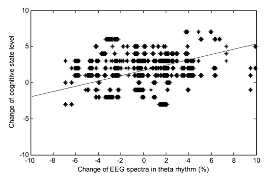 Table 3 shows the EEG correlation with CRDI results and the subjective rating of cognitive state. Theta power from the PFC was low to moderate and was significantly correlated with the cognitive state and emotional response of the subjects. Listening to FS gradually affected the subjects, arousing their cognitive state and becoming pleasant. However, only lower alpha, upper alpha, and beta power at Fp2 had significant low-to-moderate correlations with cognitive state. No similar results with intensity at other positions were found.