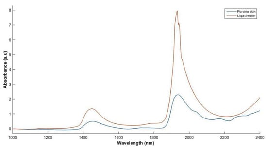 A typical NIR spectrum of liquid water versus that of porcine skin.