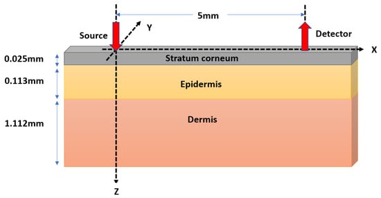Schematic of the Monte Carlo model. The semi-infinite tissue volume with the finite thickness of 1.25 mm consisting of three layers are presented in the 3D Cartesian coordinate geometry. The optical source (red downward arrow) is simulated at the origin of the coordinate system, and the detector (red upward arrow) is simulated at a distance of 5 mm from the source.