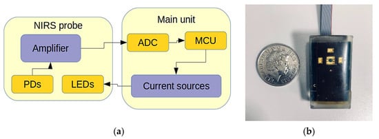 The general system structure of the multi-wavelength sensor is illustrated by the block diagram in Figure 3. The system is comprised of two separate modules; the probe which contains the light sources, detection, and amplification, and the main module that incorporates analogue to digital conversion, current sources, and USB connection for data transfer. A detailed description of the sensor can be found in [33].
